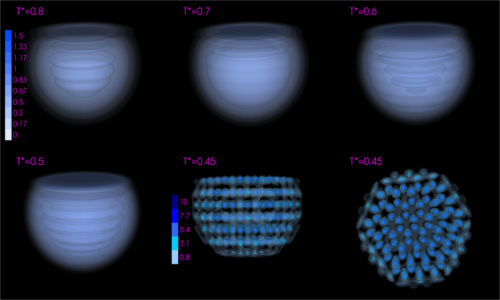 Classical DFT calculations of a liquid droplet attached to a wall. As the temperature is lowered, more and more structure develops until the droplet spontaneously crystallizes.